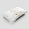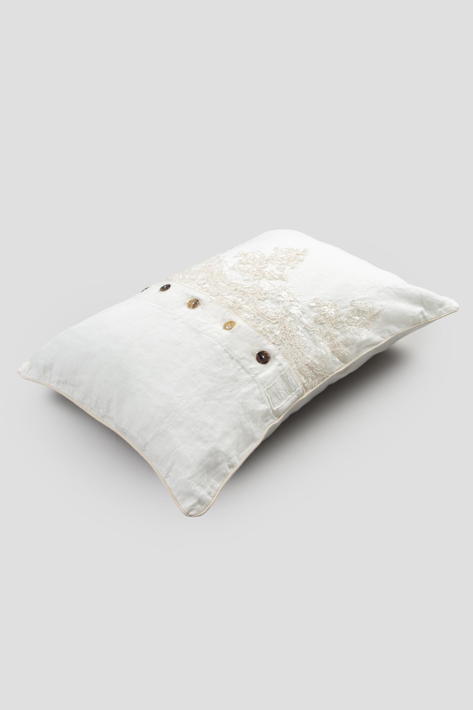 Dekorativer Kissenbezug mit einer zentralen Reihe von Agoya-Perlmuttknöpfen und eleganter Spitze. Profil mit Keder. Größe 40×60 cm.