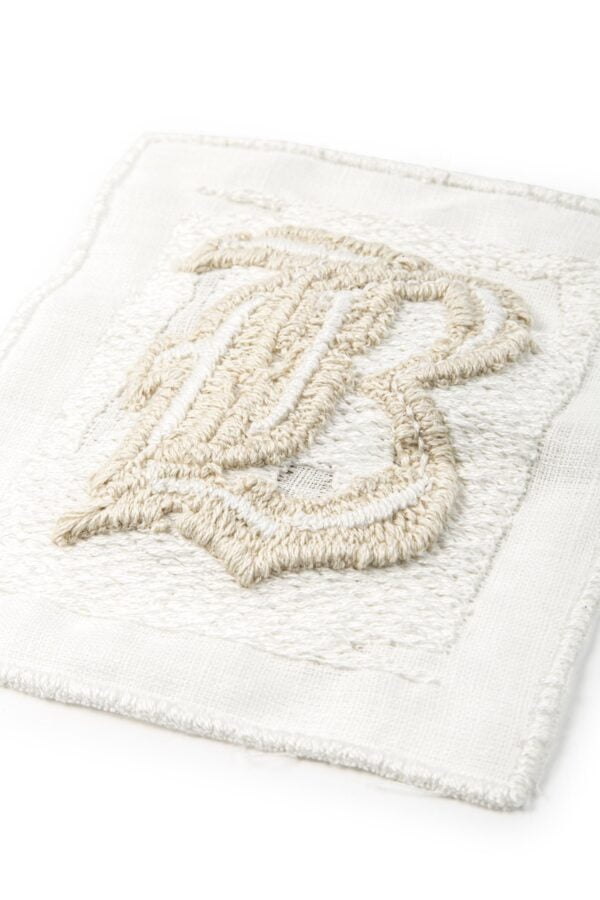 Embossed letter B embroidered on linen. Use this unique element to decorate and personalize your rooms or use it as a placeholder in your mise en place.