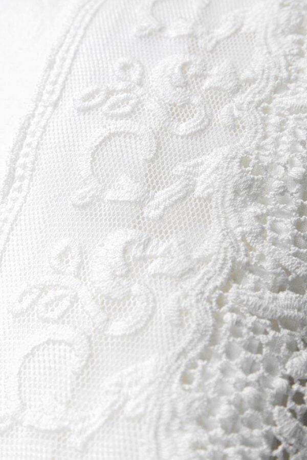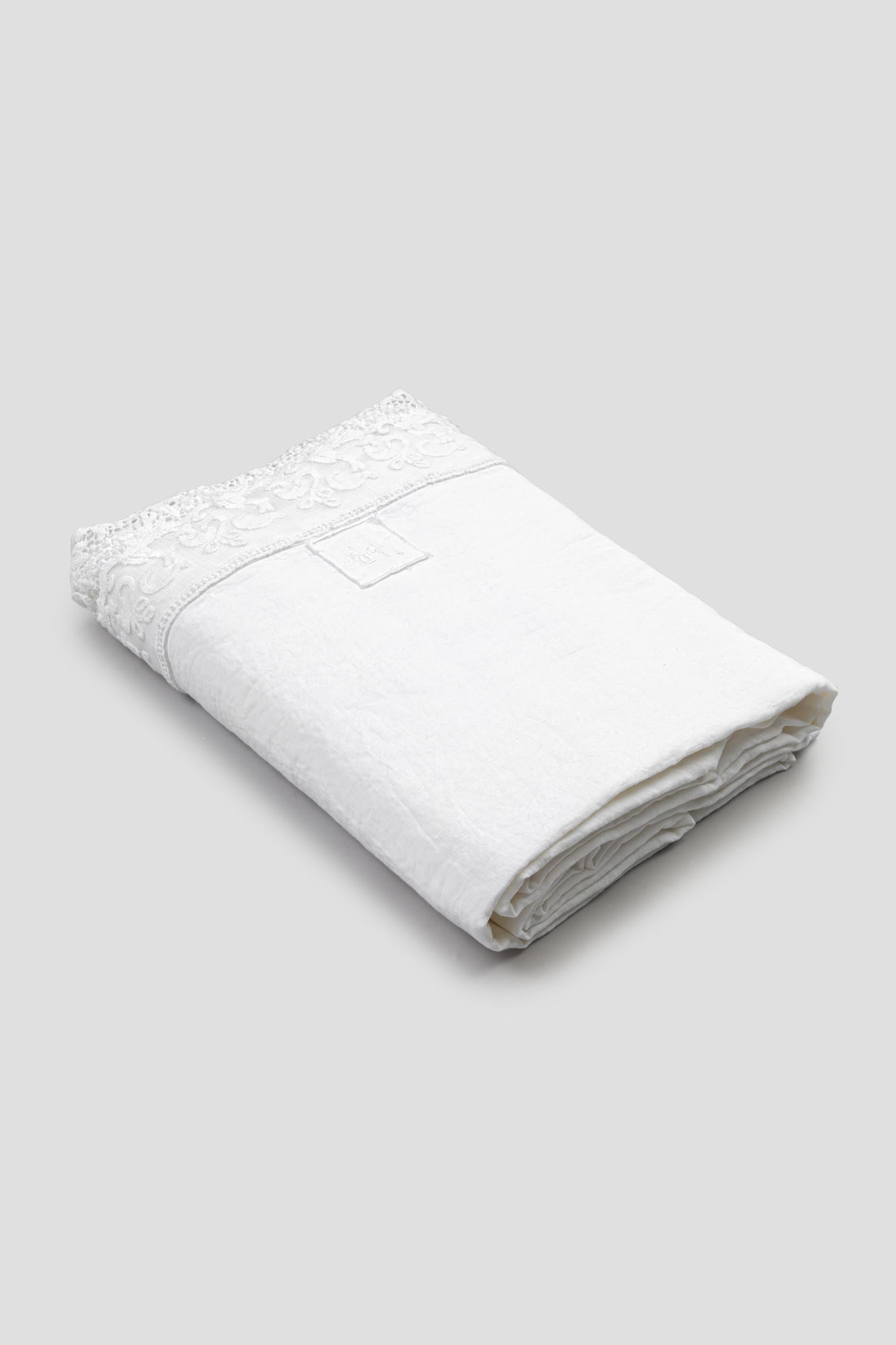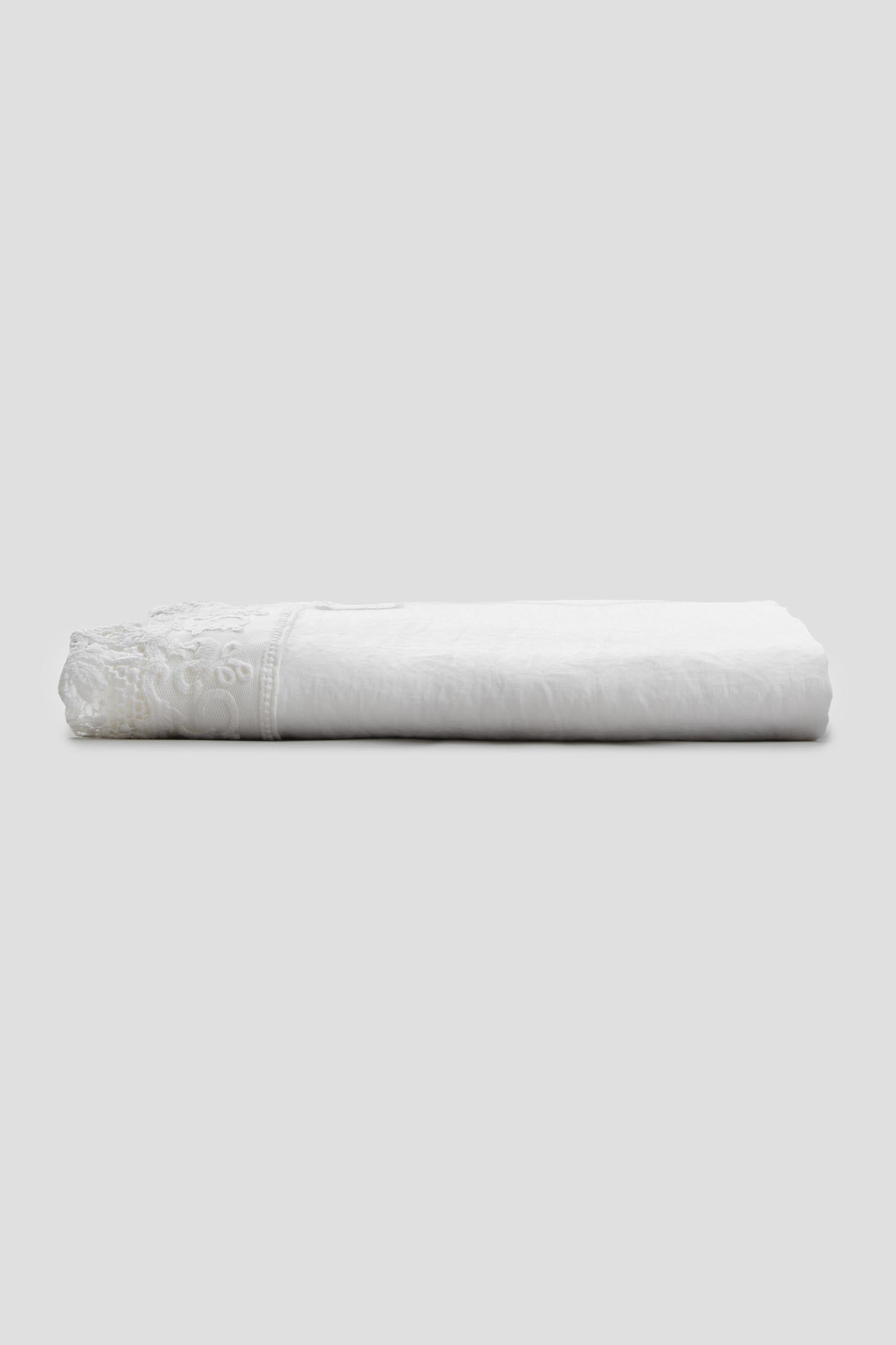 Light linen double sheet with Tulle lace sewn on one side. Arte Pura square logo insert. Edge with crease. Measures 270×290 cm.