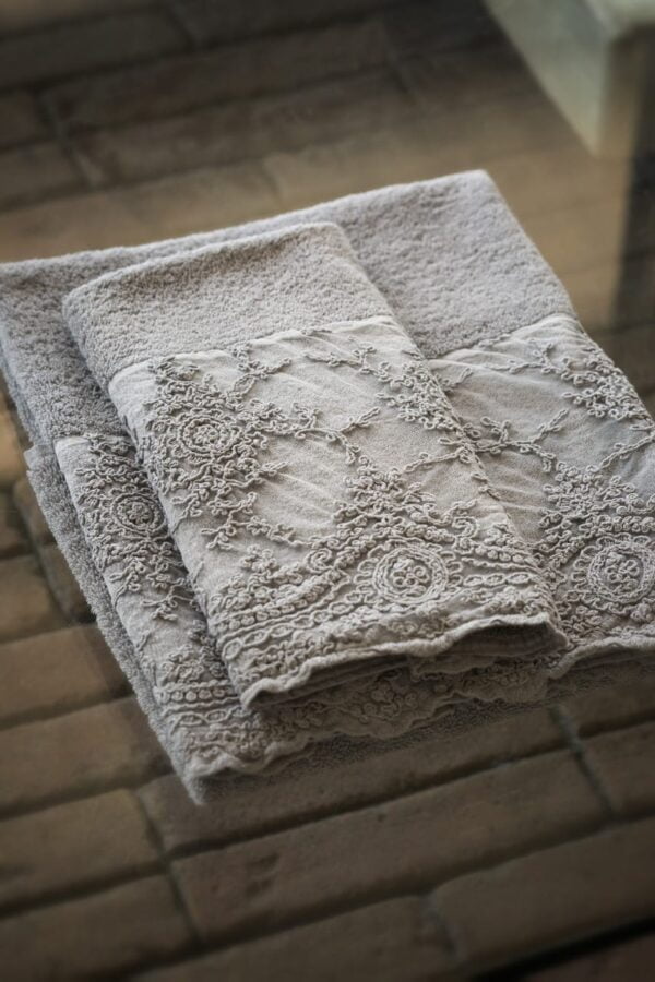 Morbida spugna e pizzo pregiato per questa coppia bagno raffinata e di confortevole utilizzo. Made in Italy. Disponibile nei colori bianco, argilla, avorio, cemento e vintage