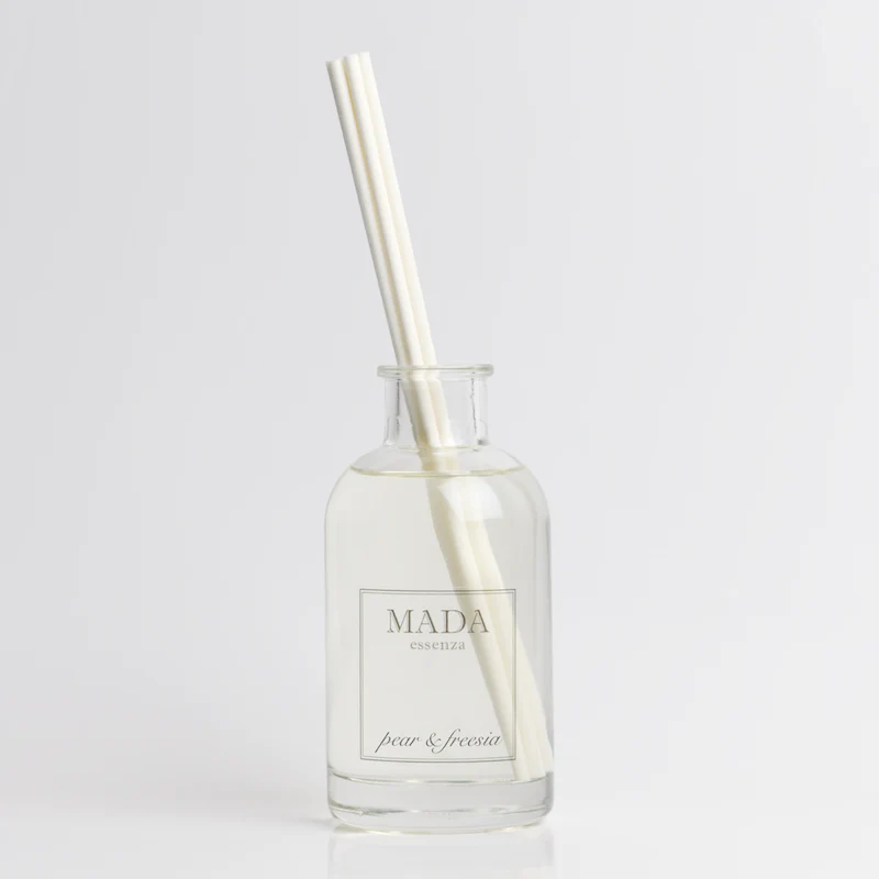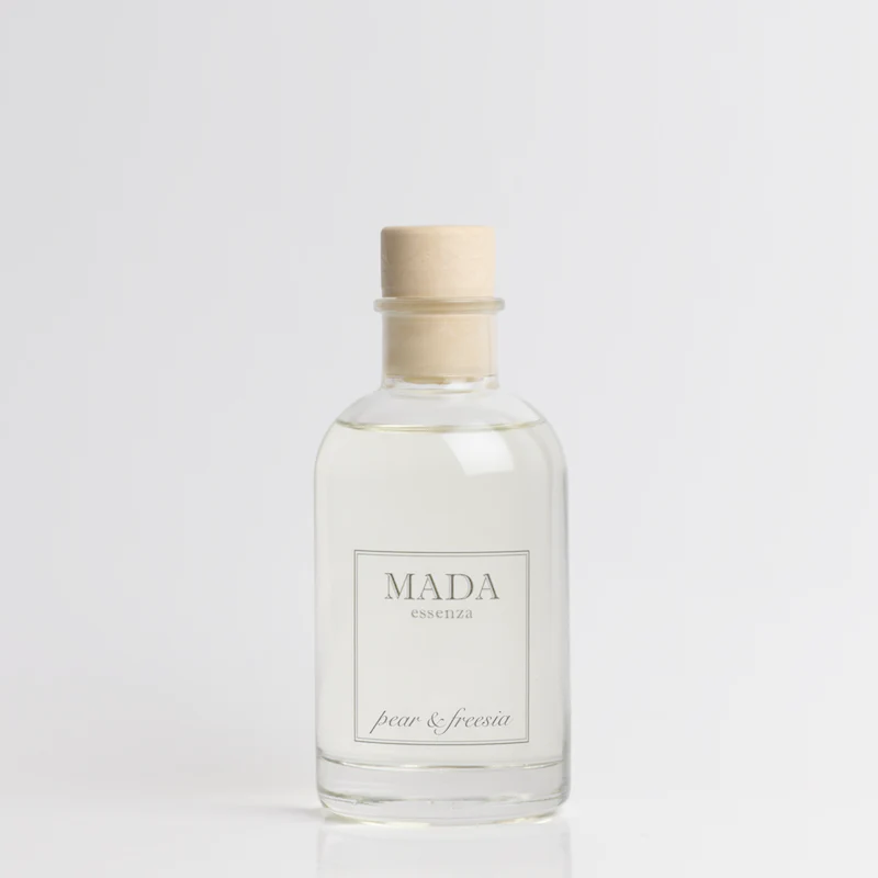 Scopri l’equilibrio perfetto tra freschezza, fiori e morbidezza legnosa con il diffusore per ambienti Pear & Freesia della linea MADA Essenza.