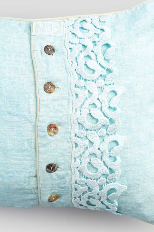 Federa decoro in lino con pizzo Poema. Profilo con piping. Misure 40×60 cm.